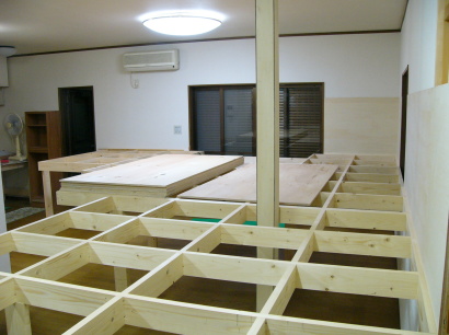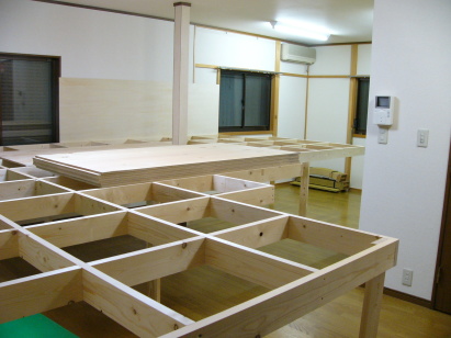 フレームは27mmX104mmの角材を500mm間隔で井桁に組んだものです。