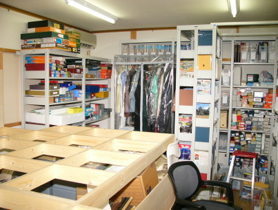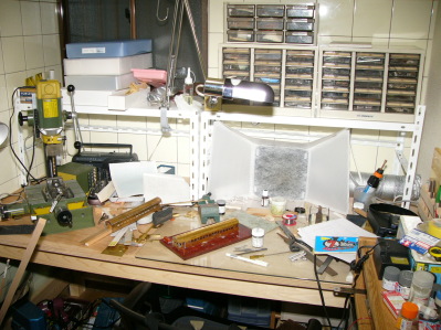 本線の一部が台枠からはみ出して斜めに横断するので、その位置の検討中です。 レイアウト右奥には、資料保管用の書棚が設置されました。 線路の一部は、この棚の中を通過する予定です。 すでに模型で一杯ですが・・・ 工作台も部品棚が設置され、それらしくなりました。 作業面の奥には換気ファンも設置され、半田付けや接着剤のガスが室内に充満しないようにしています。