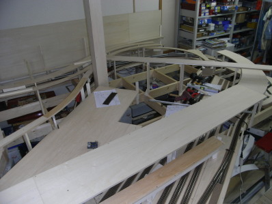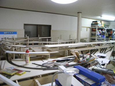 第3層の路盤がほぼ取り付けられた状態で、レイアウトの完成時の姿が想像できるようになりました。 中央駅予定地を上から見ると。 駅の下の幅の広い路盤は、第2層の電車ヤード予定地。 さらに中央駅の端を跨ぐ直線の路盤は第4層の駅へ行く本線です。 右の壁際に立つ高いライザーが第4層の駅の位置です。