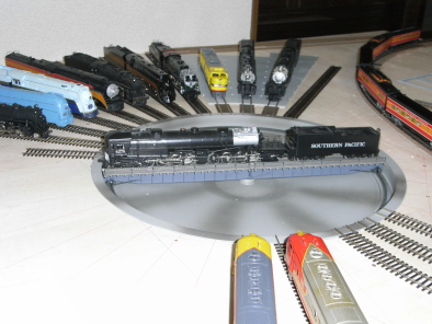 ターンテーブルで転向中のキャブフォワード(天賞堂製) ブラス製の大型機も問題なく転回。 位置決めも自由にプログラムできるので、先に線路を敷いてから停止位置を任意に決めることができます。 給炭塔はウォルサーのプラキット、仮組みで置いた状態です。 DCCのコントローラーもレイアウトに埋め込みました。