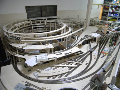 第2層までスパイラルループが敷設され、電車ヤードのポイントを取り付け中。
