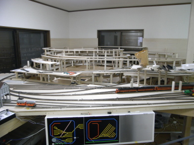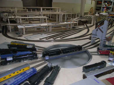レイアウトの工事は小休止で、車輌のDCC化が進行しています。これもコントロールボードが完成したことの影響です。 DCCの効果で、ポイント操作以外は、キャブ選択操作やリバースの極性切替などの面倒な操作は不要となり、ストレスがなく多列車の運転ができる。 ターンテーブルの周囲には、順次DCC化された機関車が並ぶ。 レイアウトの試運転用に、カーブが苦手な大型機や、ヨーロッパ規格の車輌などを取り混ぜて揃えています。 DCC化を機会にモーターの載せ換えをしたりして、結構手間はかかります。