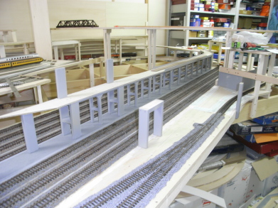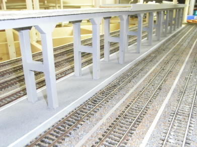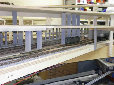 高架橋の下にホームを設置。 アメリカ式でホーム面はレール面より1mm高いだけ。 ホームの上面はモーリンのアスファルト道路キットで舗装。 高架橋がほぼ完成し、第2層の陰になる部分を仕上げていきます。 ヤードと右端の本線の間に台形の空き地が生まれたので、急遽保線区を建設することに決定。 線路を仮配置して位置を検討。 2線の側線の奥には作業員詰所(ヒルマモデルクラフトのキット)を配置 第2層の高架線、第3層の高架駅が上に出来ると、こんな感じに