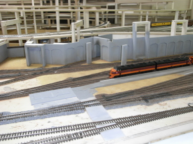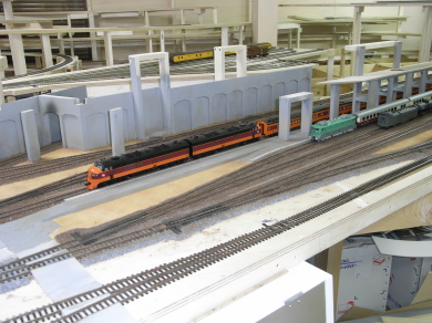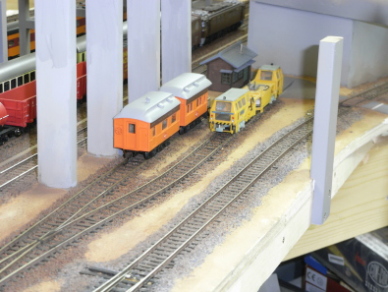 第1層の駅の部分のバラスト撒きが終わり、背景となる壁などを取り付けました。この後、駅を覆う形で第2層の路盤を載せます。その前に、レールの上に付着した塗料や接着剤を除去し、試運転調整を行いました。