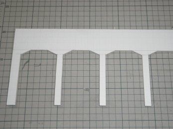 壁は2mmの合板のベースに、方眼ケント紙に3mmバルサを裏打ちした高架橋のシルエットを貼り付けて、塗装しました。