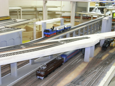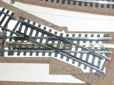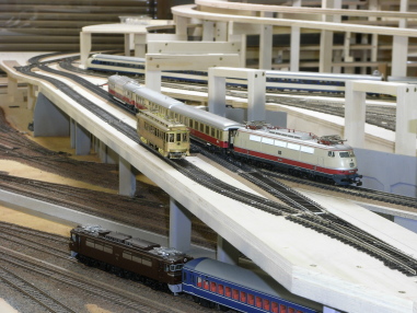 本線からトロリーラインへの亘り線がメルクリン線と交差している。