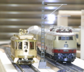 もちろんトロリーラインはDCC方式の2線式なのでメルクリンと直通運転は出来ないが、このポイントで両線を連絡してトレーラーは乗り入れ可能にしています。