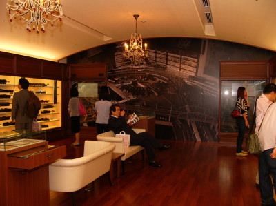 芦屋のシャングリ・ラ鉄道をイメージさせるサロン風の部屋の両側に展示ケースが並んでいます。