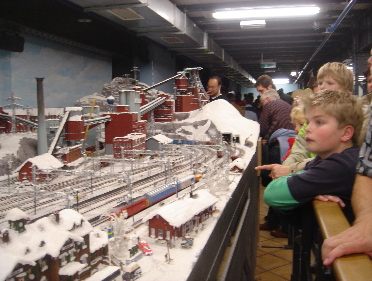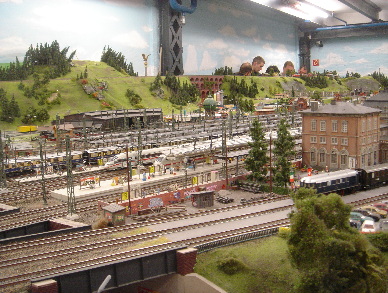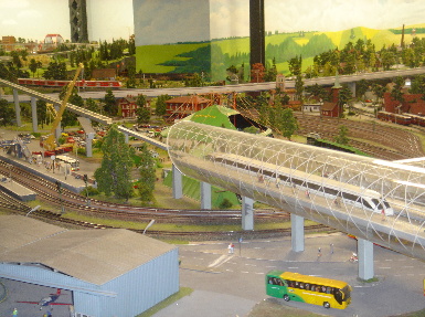 このレイアウトでは、鉄道だけでなく自動車も自動制御で走行しています。写真のバスも実際に動いています。